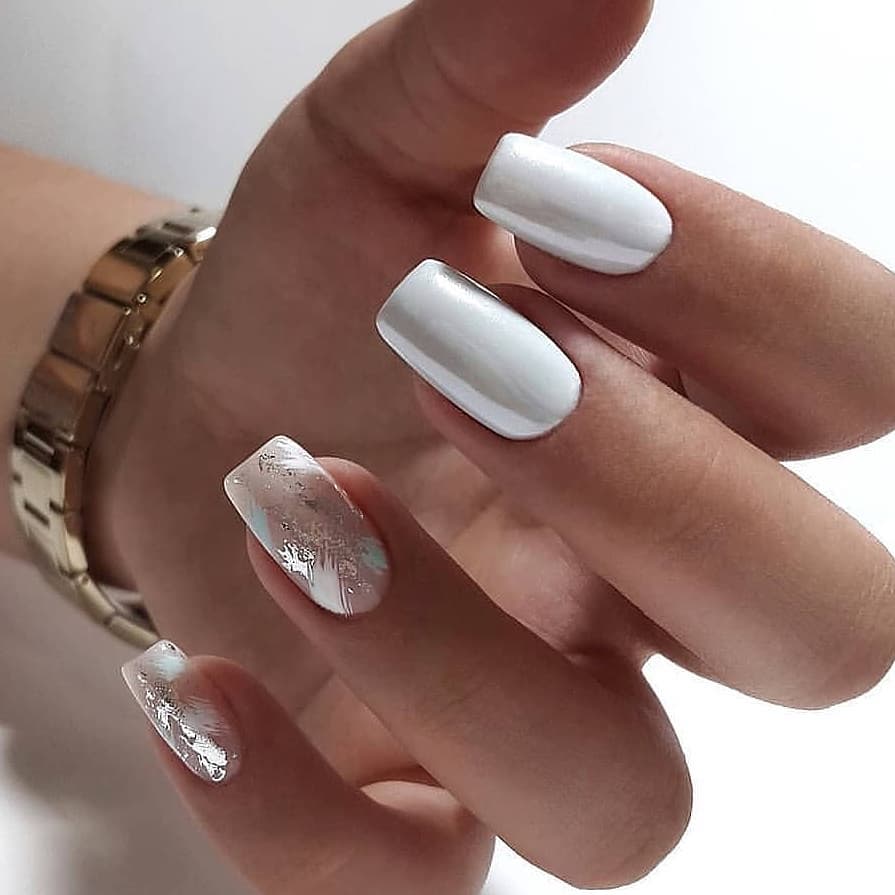 - Effetto Ghiaccio – Unghie bianche con un leggero effetto perlescente o trasparenze ghiacciate.